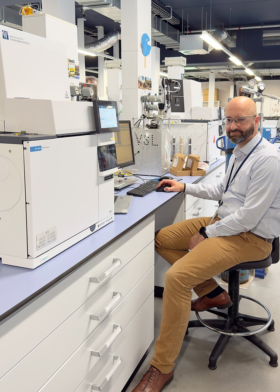 Hoofd van het Metering labo Marcio Teixeira da Silva bij een van de drie speciaal getunede Agilent 8890 GC’s, die worden gebruikt bij het valideren en kalibreren van de micro-GC’s.