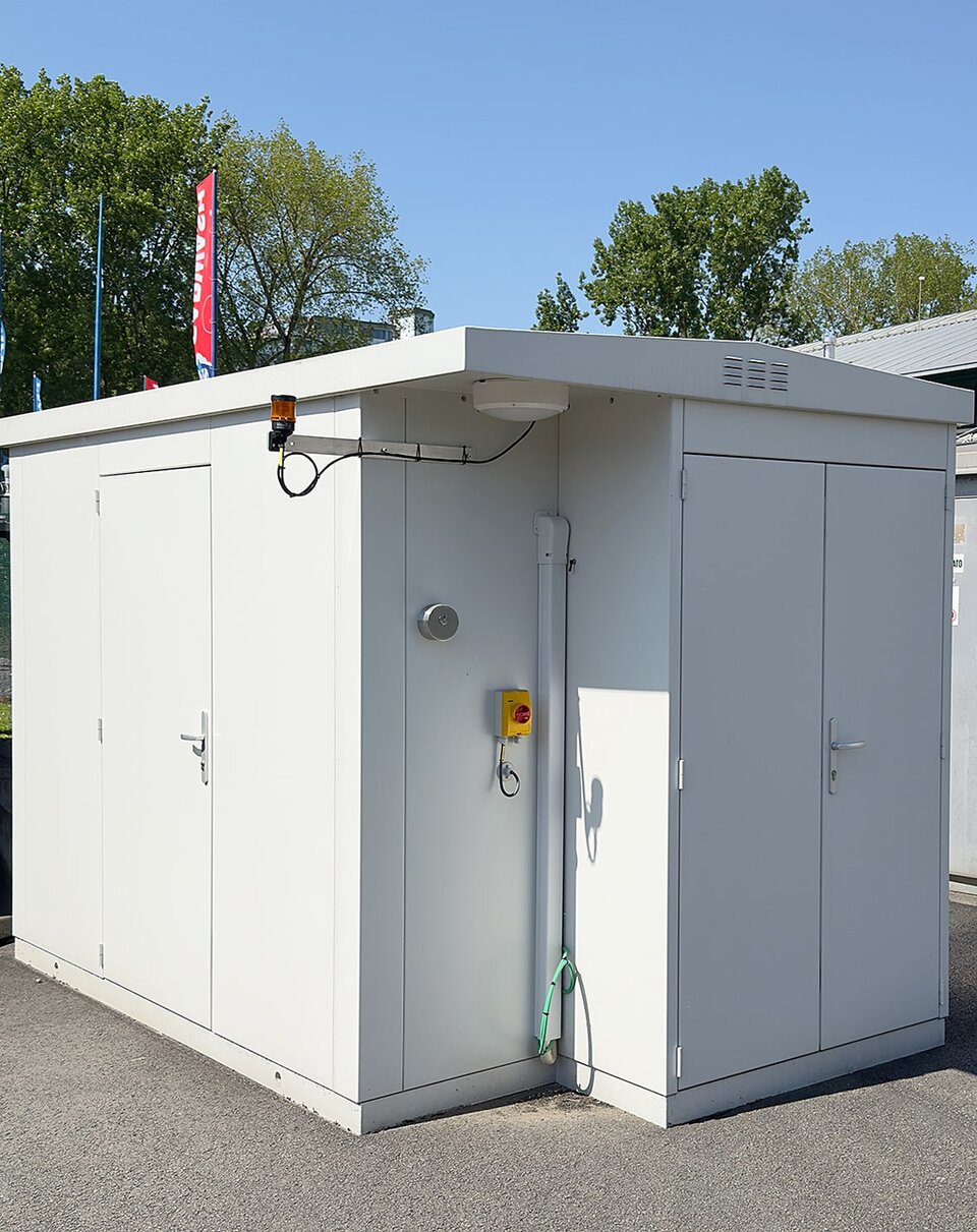 Een volledig ingerichte meetcabine staat klaar voor transport naar een gasleiding bij een gascentrale in Wallonië.