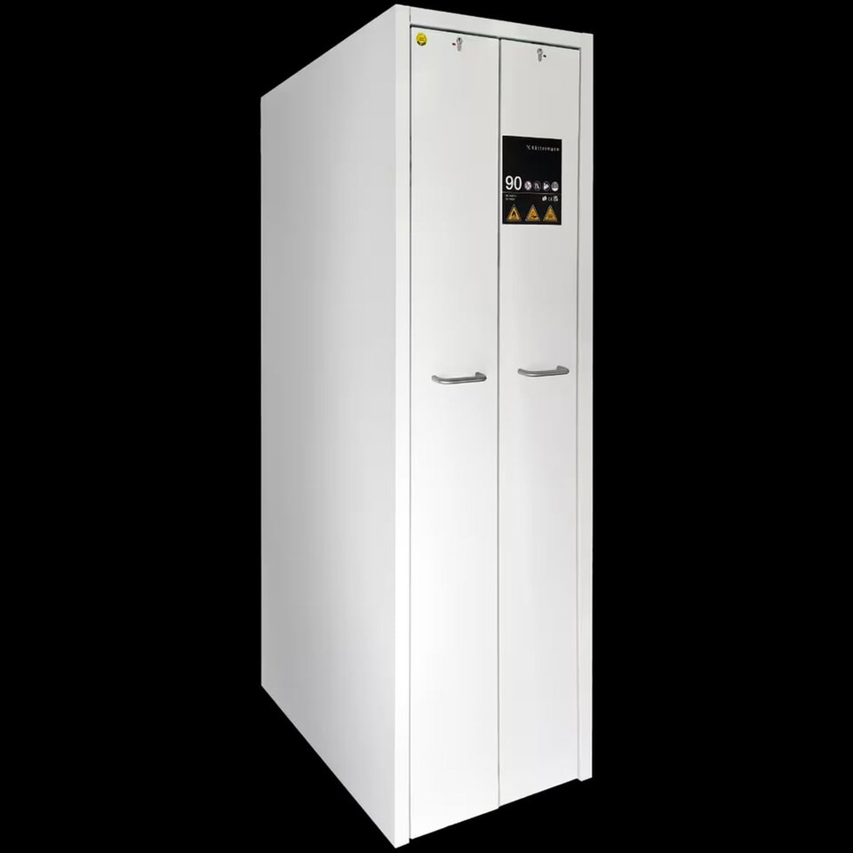 Bespaar kostbare laboratoriumruimte door de opslag van brandbare en corrosieve gevaarlijke stoffen zoals oplosmiddelen, zuren en basen te combineren. Een apart afsluitbaar gifcompartiment voorkomt ongeautoriseerde toegang tot giftige stoffen. Je bespaart niet alleen ruimte, maar vermindert ook de hoeveelheid afgevoerde lucht die wordt gegenereerd omdat je nu één in plaats van drie aparte kasten kan gebruiken.